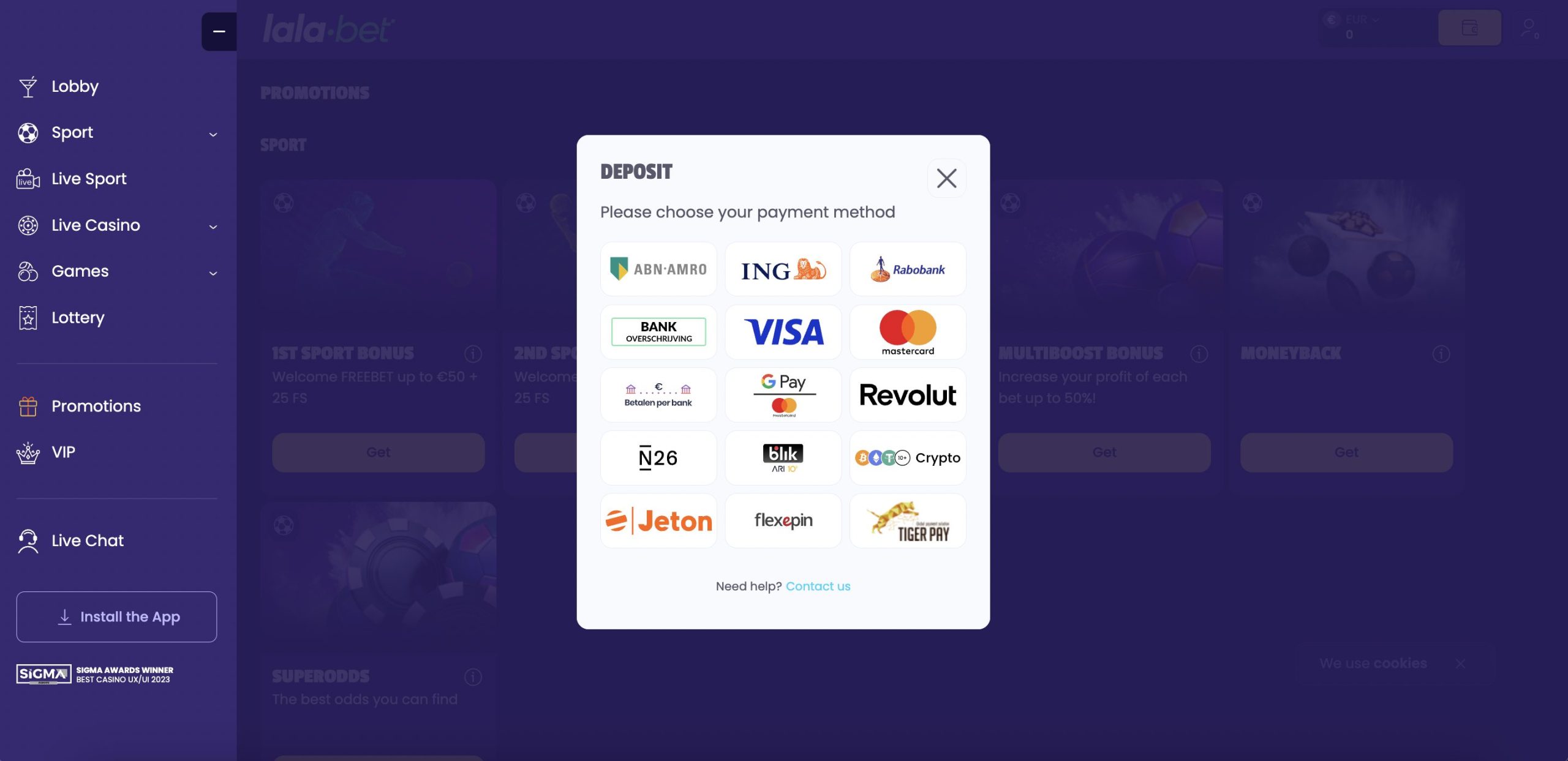 Je kunt direct ondersteuning krijgen door de live chatfunctie te activeren. Deze functie, die 24/7 beschikbaar is, is de voorlaatste optie in het dropdownmenu aan de linkerkant en wordt bemand door een getrainde klantenservicemedewerker. Deze methode is de beste optie voor eenvoudige tot gemiddeld complexe problemen. Als de live chat onvoldoende hulp biedt, kunt u het probleem escaleren door een e-mail te sturen naar support@lala.bet. Een deskundige klantenservicemedewerker zal uw e-mail, inclusief eventuele screenshots, grondig analyseren. Nadat u uw e-mail hebt verzonden, duurt het maximaal 24 uur voordat u een uitgebreid antwoord in uw inbox ontvangt.